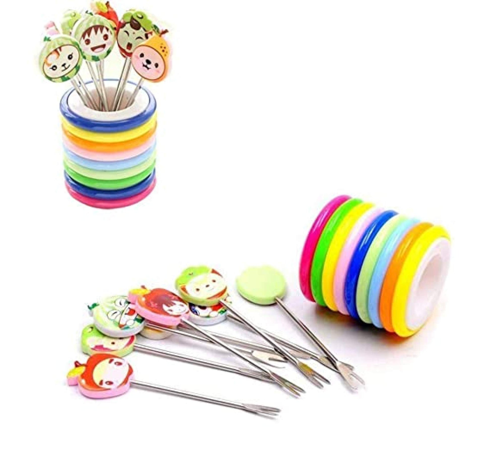 Cute Set of 6 Fruit Forks with Holder Stainless Steel Food Pick Forks for Kids Home (Mix Cartoon)