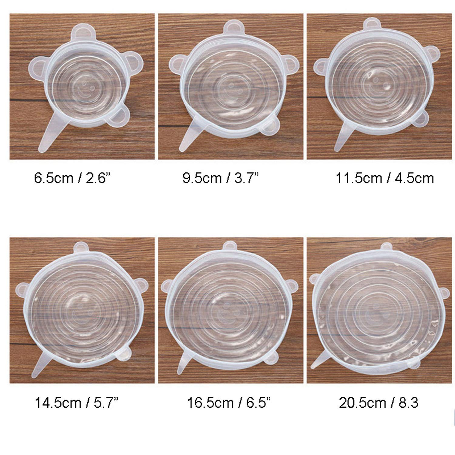 - Multi Size & Cycle Use - The Silicone Stretch Lid Include Various Sizes, Which Are Compatible For Bowl, Can, Jar, Glassware, Food Saver Covers Safe In Dishwasher, Microwave And Freezer. Totally 6 Pieces Per Set: 2.6', 3.7', 4.5', 5.7', 6.5', And 8.3'.